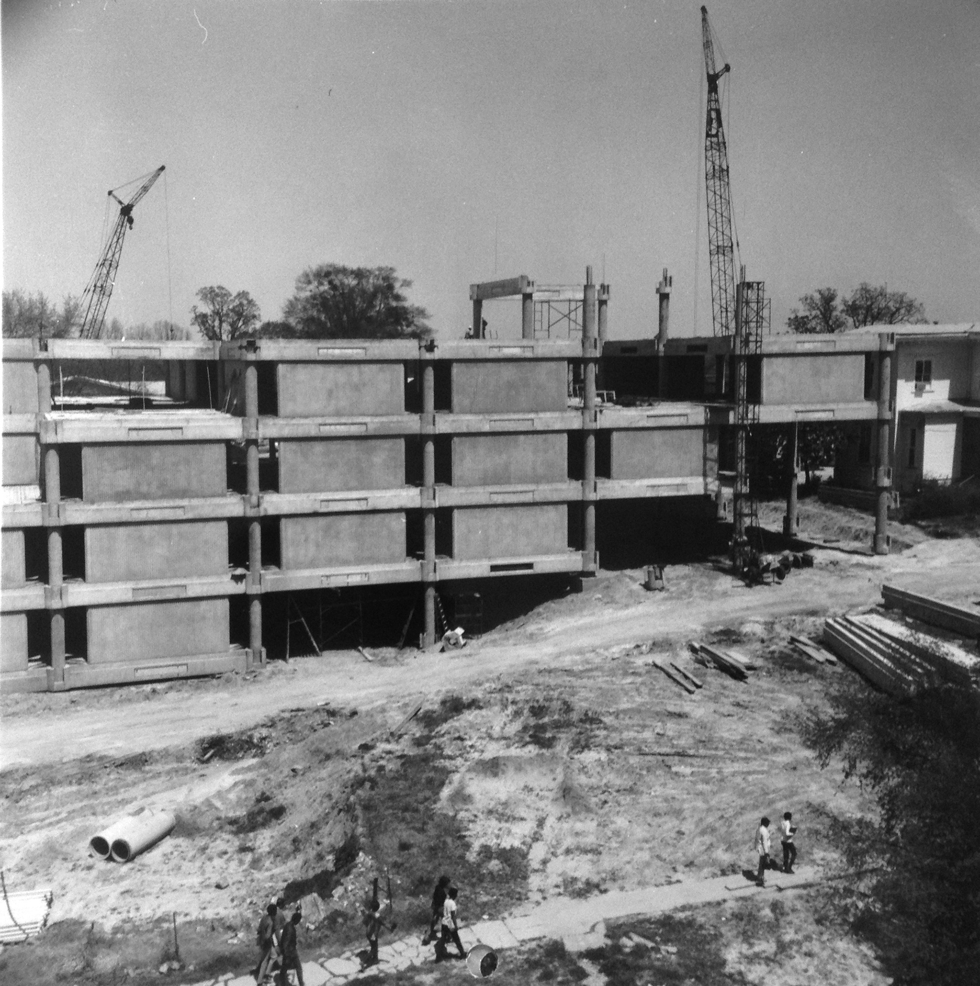 Construction photograph showing Tougaloo College Library, Jackson, Mississippi designed by Gunnar Birkerts and Associates, ca. 1970. Bentley Historical Library, University of Michigan.